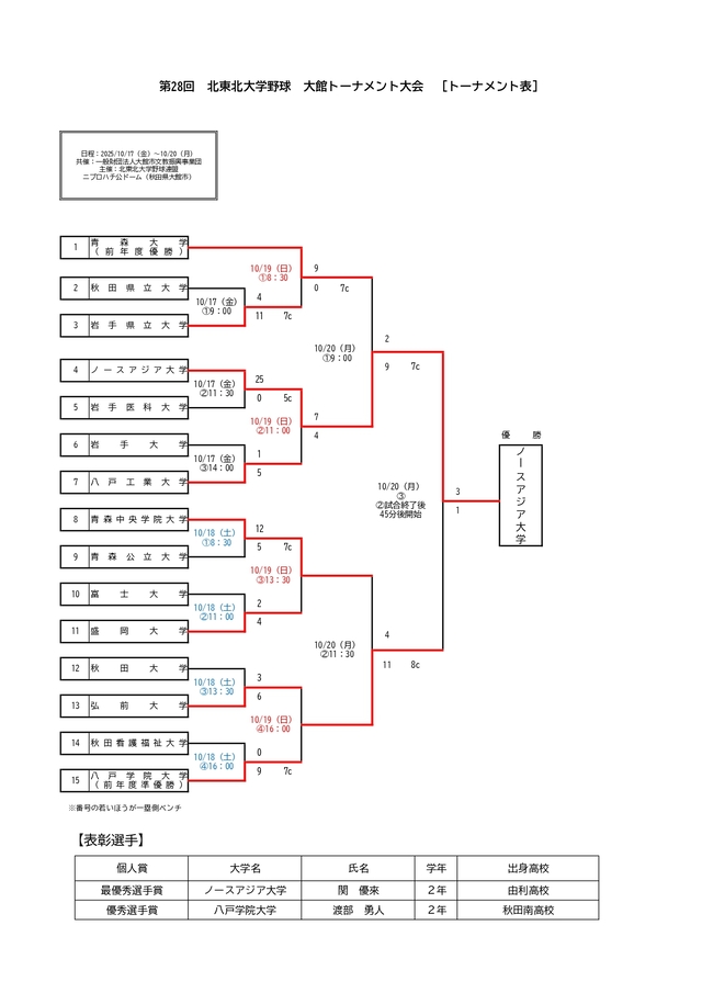 ※1回戦の仙台六大学野球連盟2位と北東北大学野球連盟1位との試合は、北東北大学野球連盟1位チームに1勝のアドバンテージを与え、仙台六大学野球連盟2位チームが先勝した場合は、同日第3試合に第2戦を行う。